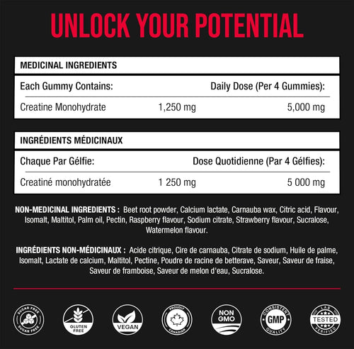Creatine Gummies – Creatine Monohydrate – 120 Gummies (1250 mg Each) – Ships Free Within Canada on Orders Above CAD $199